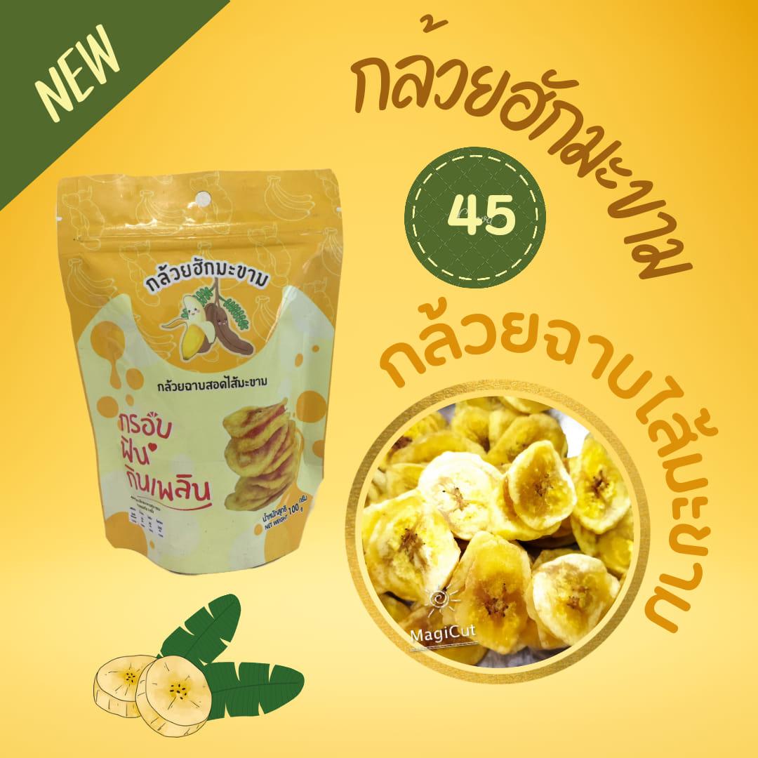 สัมผัสความหอมของกล้วยหินสีเหลืองทองทอดกรอบ ที่ทอดด้วยเตาถ่านจากไม้มะขาม สอดไส้มะขามกวนเปรี้ยวอมหวานสูตรพิเศษ กลายเป็นเอกลักษณ์ของ "กล้วยฮักมะขาม"ถ้าได้ชิมแล้วจะหยุดไม่อยู่ให้ความรู้สึก กรอบ ฟิน กินเพลิน และที่สำคัญควบคุมการผลิตด้วยมาตรฐาน อย. รับรองได้ว่า กล้วยฮักมะขาม อร่อย สะอาด ปลอดภัยต่อผู้บริโภคแน่นอน ยังไม่พอเรายังบรรจุในซองที่สวยงามทันสมัยคงความหอม สด ใหม่ แค่เปิดซองก็ได้สำผัสถึงหอม อร่อย เหมือนพึ่งออกจากเตา