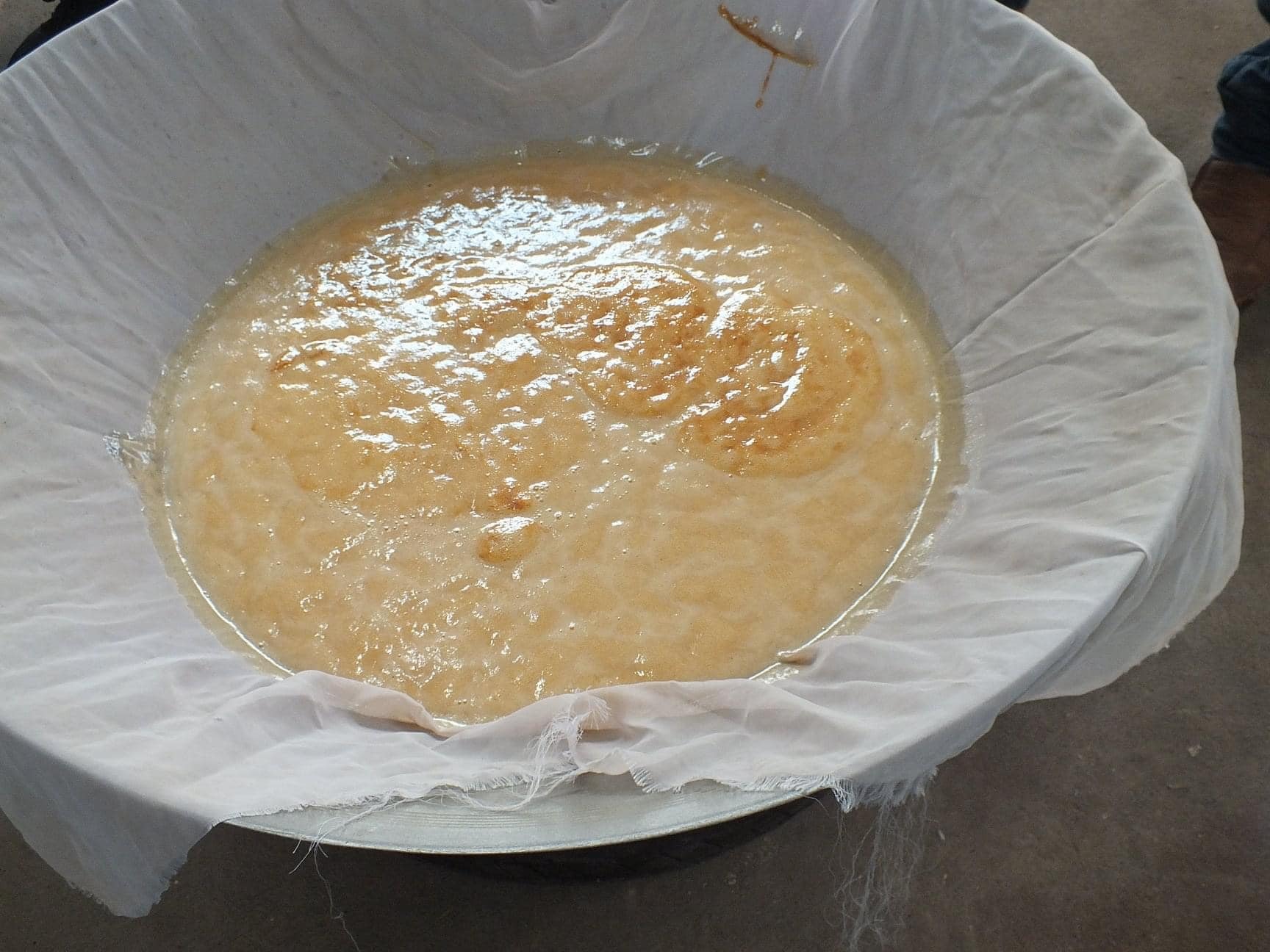 ชาวสวนขึ้นน้ำตาลสดวันละ 2 รอบ เช้า-เย็น เพื่อนำน้ำตาลมาเคี่ยวทุกวันล้างกระบอกรองน้ำตาลด้วยน้ำร้อนในกะทะ