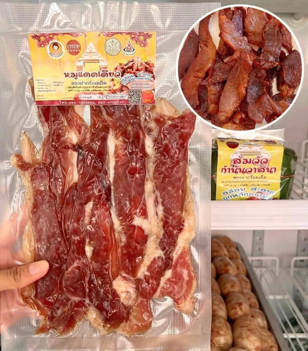 จึงเริ่มวางขายแนื้อแดดเดียว ที่คัดสรรเนื้อหมูคุณภาพพรีเมียม โดยเลือกใช้ เนื้อหมูส่วนสะโพก จากฟาร์มที่ได้มาตรฐานในอำเภอศรีสมเด็จ จังหวัดร้อยเอ็ดเท่านั้น! เพราะเรารู้ว่าเนื้อส่วนนี้มีไขมันแทรกกำลังดี ทำให้หมูแดดเดียวของเรานุ่ม ไม่กระด้าง ไม่แข็งกระด้าง เคี้ยวง่าย ละมุนลิ้นทุกคำที่ได้ลอง