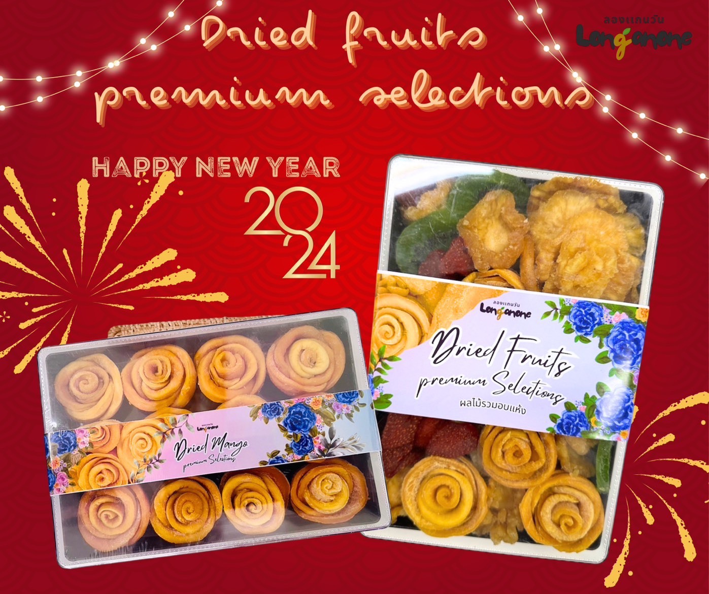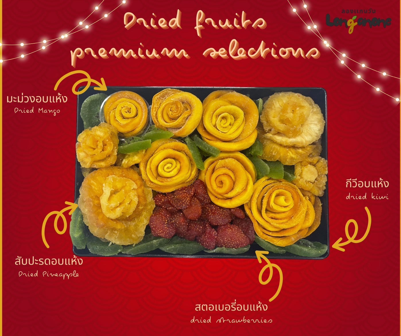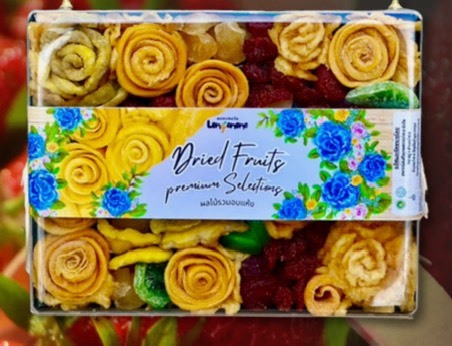 ชุดผลไม้อบแห้ง หลากหลายชนิด จัดแต่งเป็นรูปดอกไม้ บรรจุในกล่องใส สวยงามน่ารับประทาน เหมาะสำหรับเป็นของขวัญของฝากในเทศกาลต่างๆ