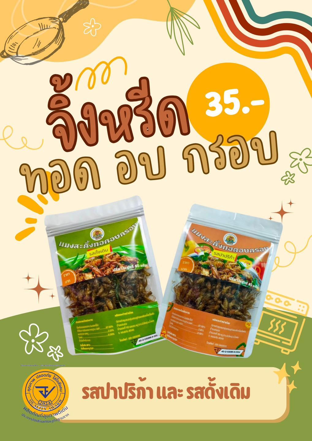 แมงสะดิ้งทอด อบ กรอบ ตรา จิ้งหรีดแสนตอ ได้ใช้จิ้งหรีดสายพันธุ์ทองแดงลาย หรือ แมงสะดิ้ง เป็นจิ้งหรีดที่นิยมเลี้ยงเพราะมีรสชาติดีหอมมัน จากเดิมมีการผลิตแบบต้มและแช่แข็ง ได้มีการพัฒนาเป็นผลิตภัณฑ์แมงสะดิ้งทอด อบ กรอบ ในรสชาติต่าง ๆ เช่น รสตั้งเดิม และ รสปาปริก้า ซึ่งได้รับเป็นผลิตภัณฑ์ที่ได้ มาตรฐาน GMP