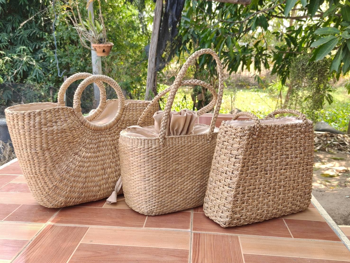 กระเป๋าถือหลากหลายรูปแบบ ผลิตจากเส้นใยธรรมชาติผักตบชวา โดยกระบวนการถักสานด้วยมือ