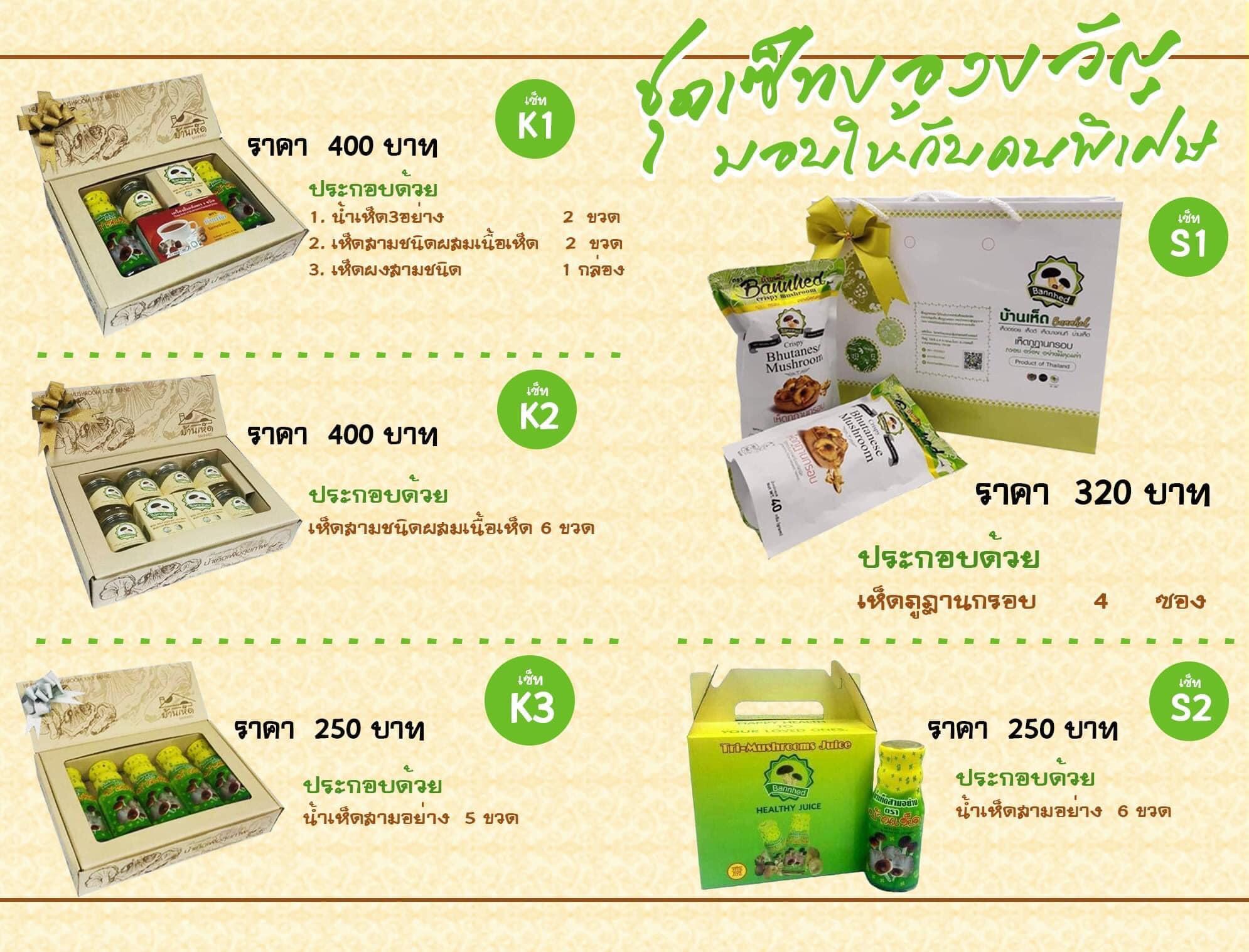 - ประกอบด้วย เห็ดถั่งเช่า เห็ดหลินจือ เห็ดยามาบูชิตาเกะ เห็ดหอม เห็ดเป๋าฮื้อ เห็ดหูหนูขาว เห็ดหูหนู เห็ดภูฏาน