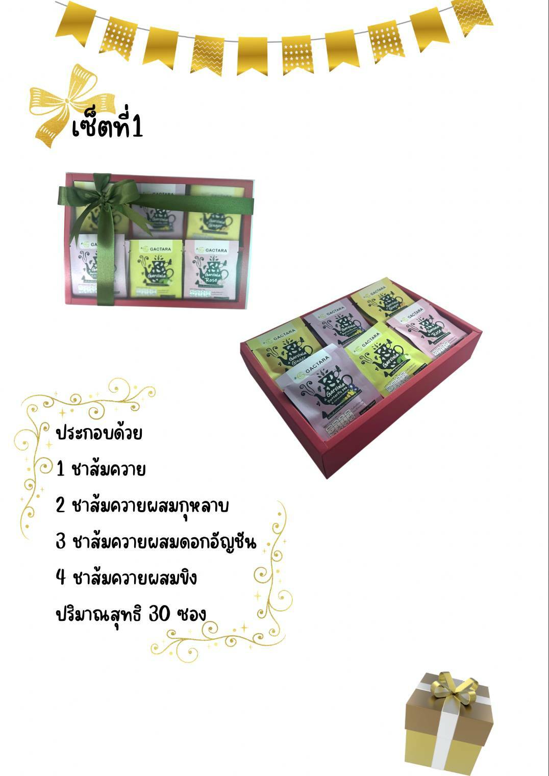 - เซต 1 ประกอบด้วย ชาส้มควาย ชาส้มควายผสมกุหลาบ ชาสัมควายผสมดอกอัญชัน ชาส้มควายผสมขิง ปริมาณสุทธิ 30 ซอง ราคาชุดละ 700 บาท