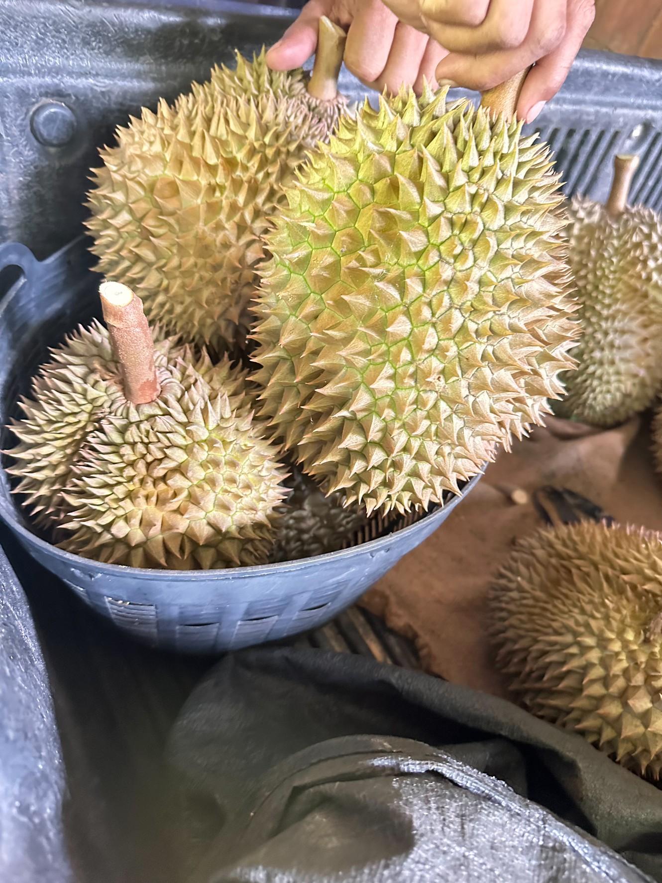 ทุเรียนหมอนทอง ใช้ถุงห่อลูกทุเรียนป้องกันแมลงศัตรูพืช ลดการใช้สารเคมี หวานอร่อย เนื้อแห้ง สีเหลืองทอง ไม่ฉ่ำน้ำ กรอบนอกนุ่มใน ทุเรียนแก่ 80-90 % รับประกันปัยหา รับเคลมทุกลูก