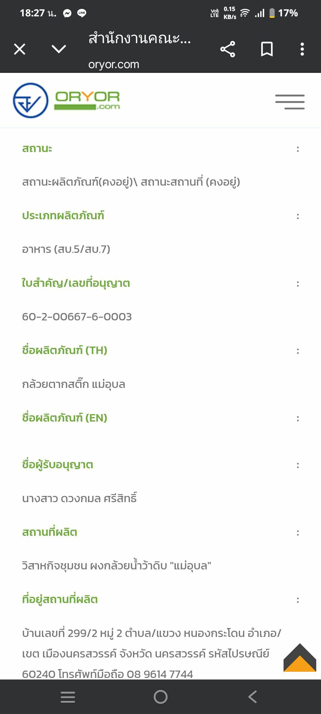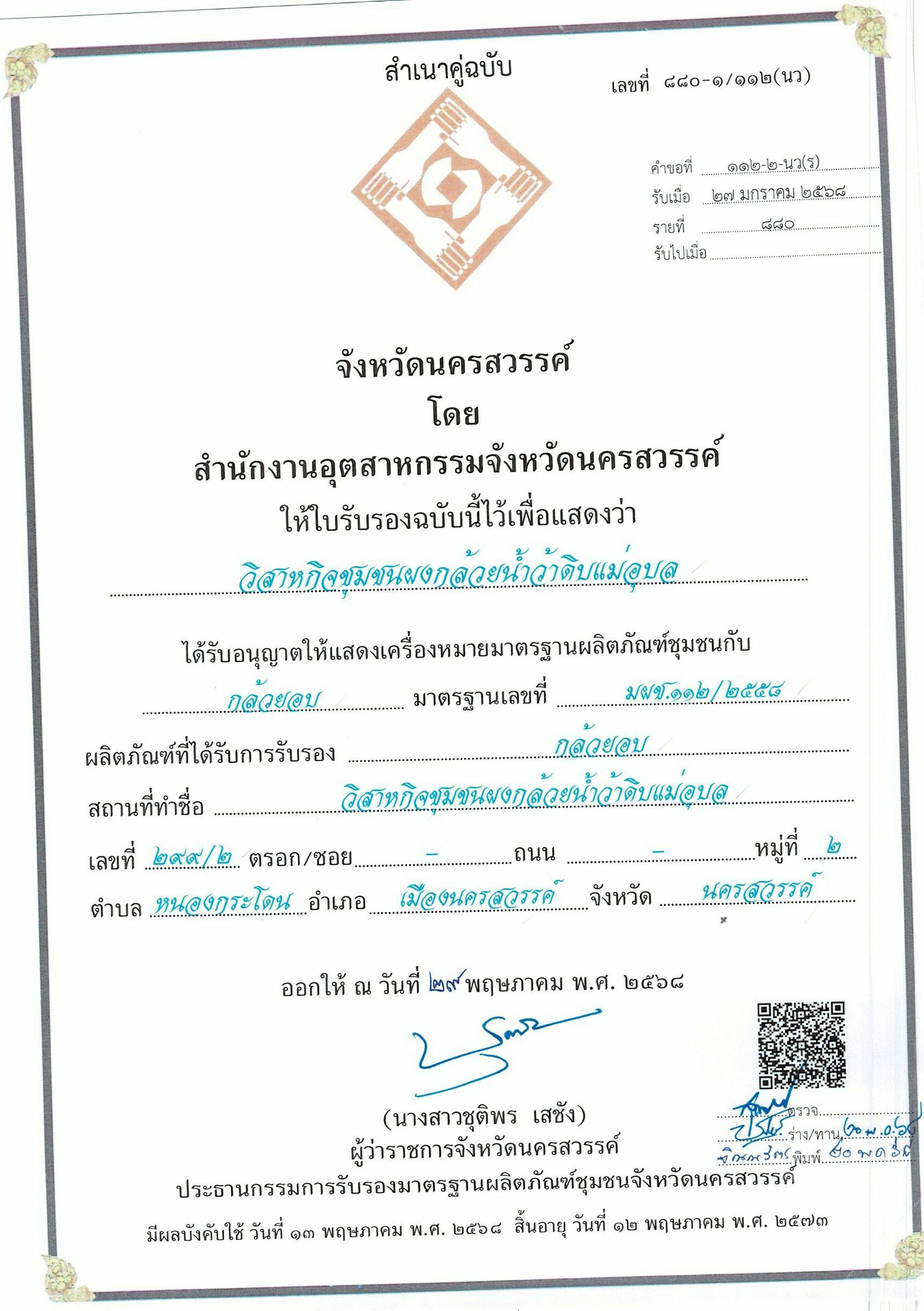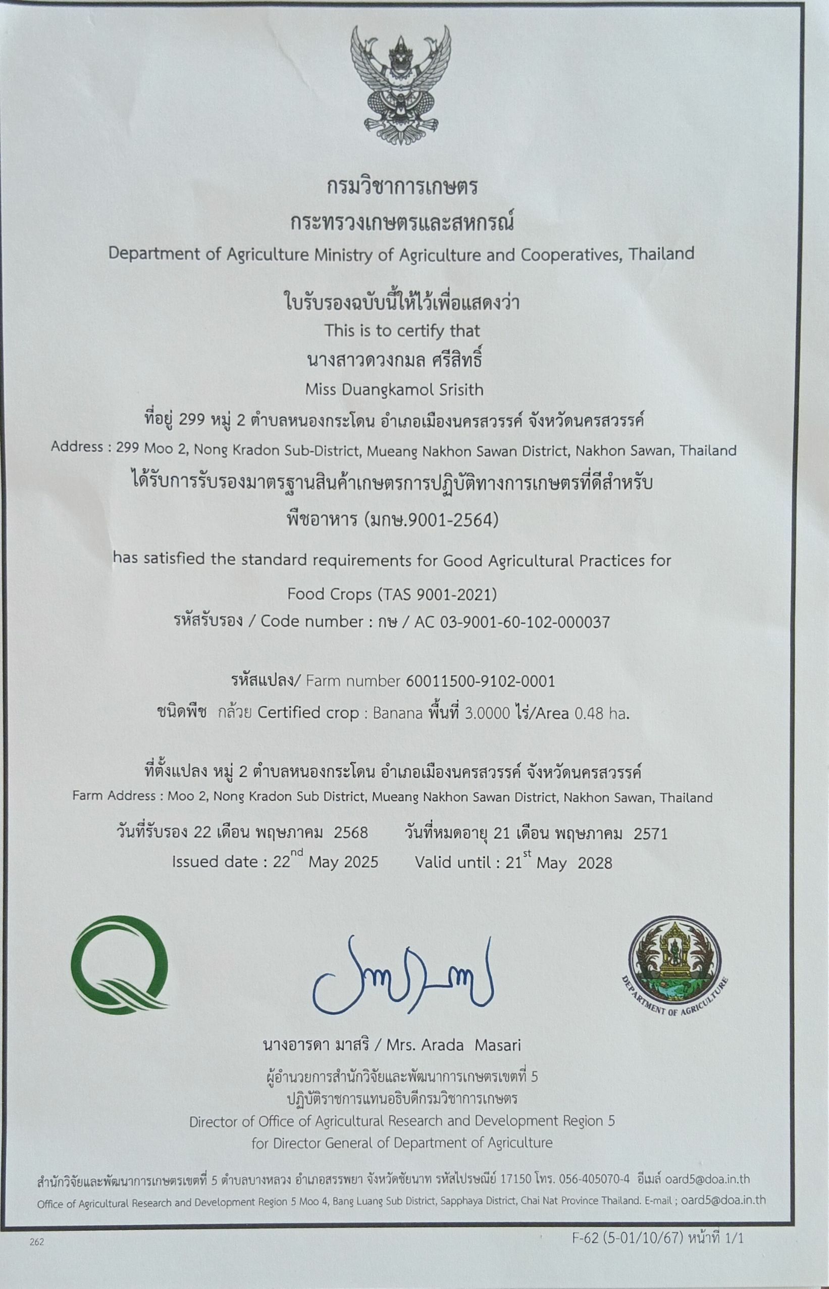 กล้วยที่นำมาผลิตได้รับมาตรฐานสินค้าเกษตรการปฏิบัติทางการเกษตรที่ดีสำหรับพืชอาหาร (มกษ.9001-2021) "GAP" และผ่านมาตรฐาน อย. ที่ 60-2-00667-6-0003