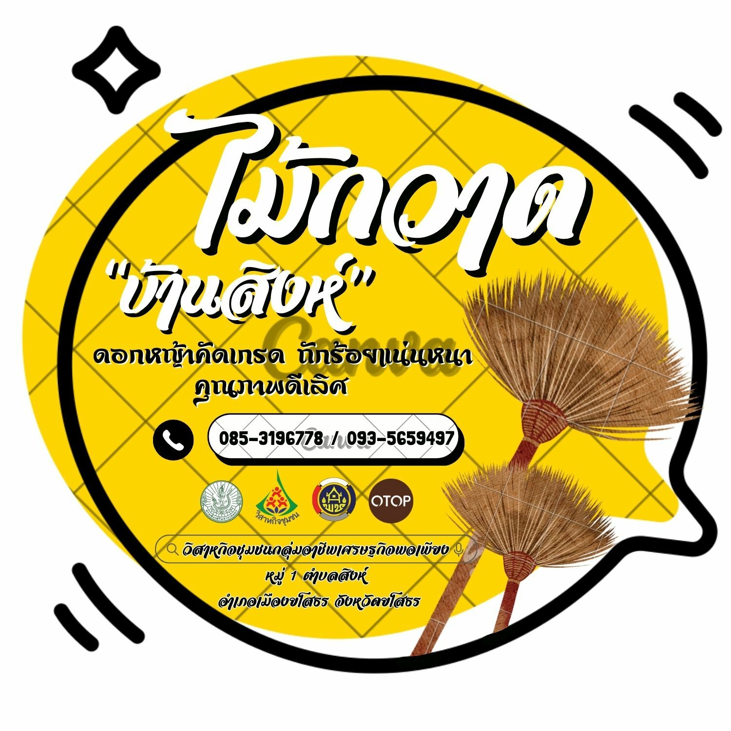 ไม้กวาด "บ้านสิงห์" ดอกหญ้าคัดเกรด ถักร้อนแน่นหนา คุณภาพดีเลิศ ผลิตโดย วิสาหกิจชุมชนกลุ้มอาชีพเศราฐกิจพอเพียง หมู่ 1 บ้านสิงห์ ตำบลสิงห์ อำเภอเมืองยโสธร จังหวัดยโสธร