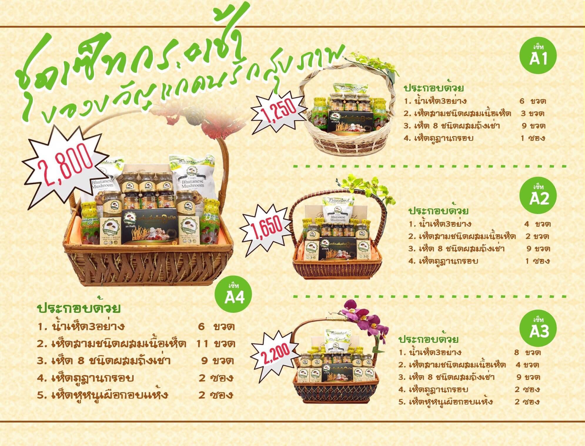 • ประกอบด้วย เห็ดถั่งเช่า เห็ดหลินจือ เห็ดยามาบูชิตาเกะ เห็ดหอม เห็ดเป๋าฮื้อ เห็ดหูหนูขาว เห็ดหูหนู เห็ดภูฏาน